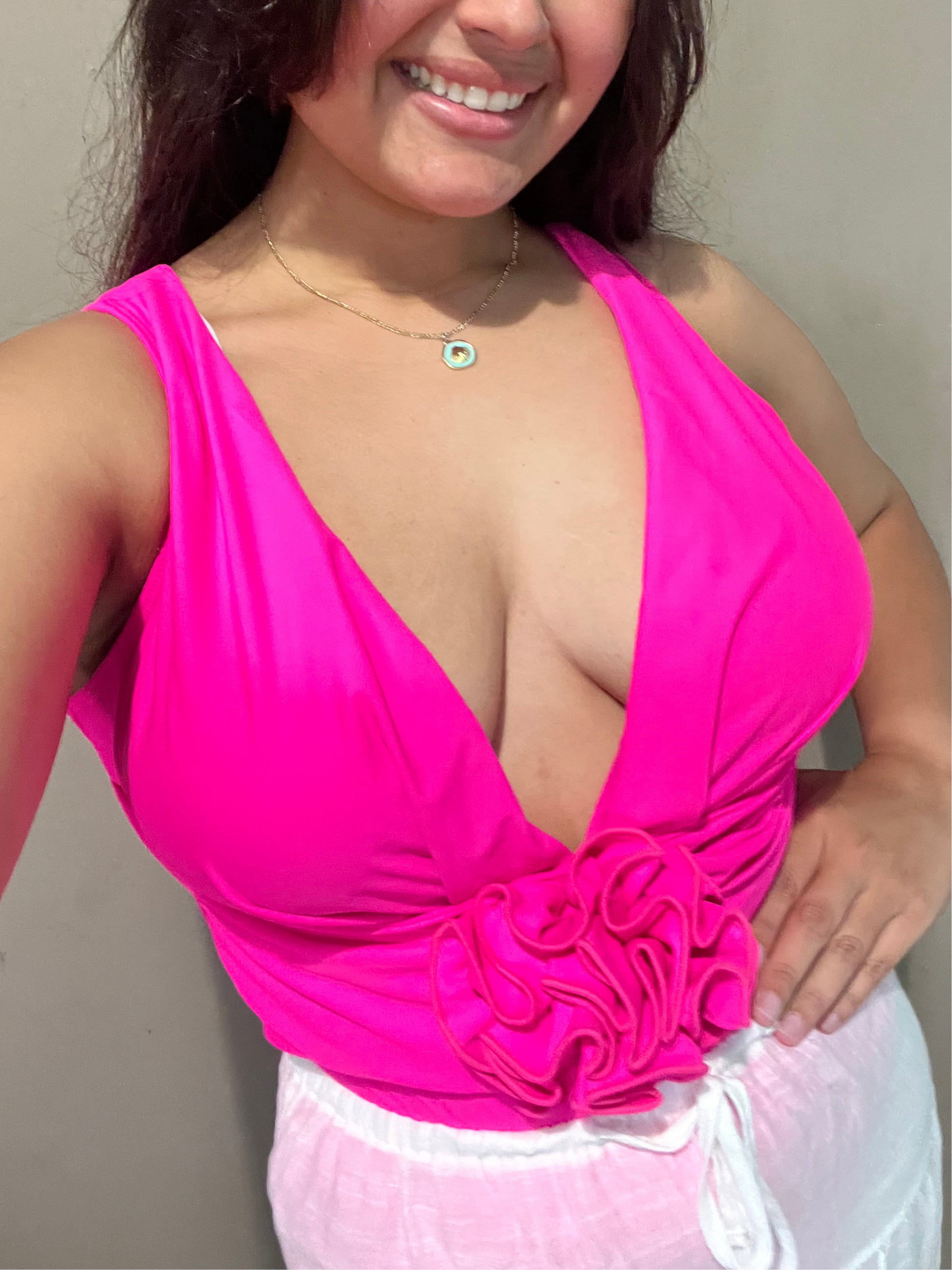 One-piece swimsuit with a V-neckline and a large flower in the center. Can be worn as a bodysuit.